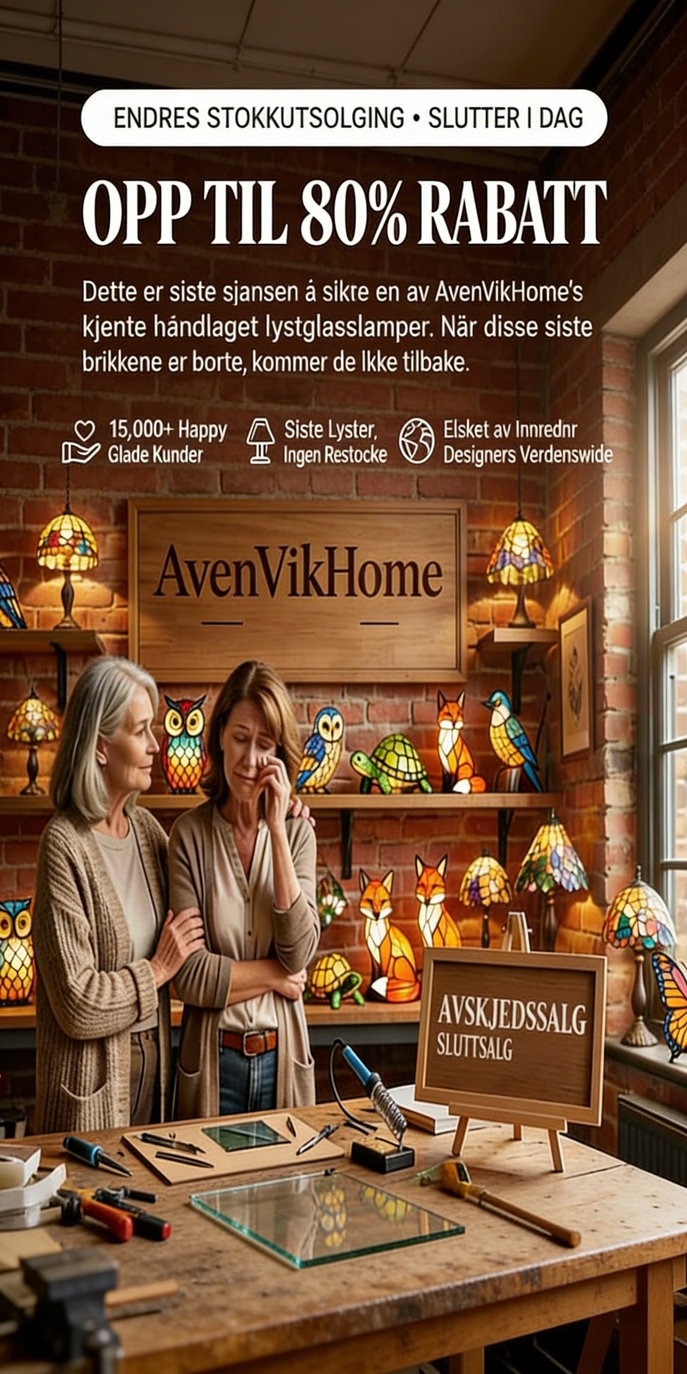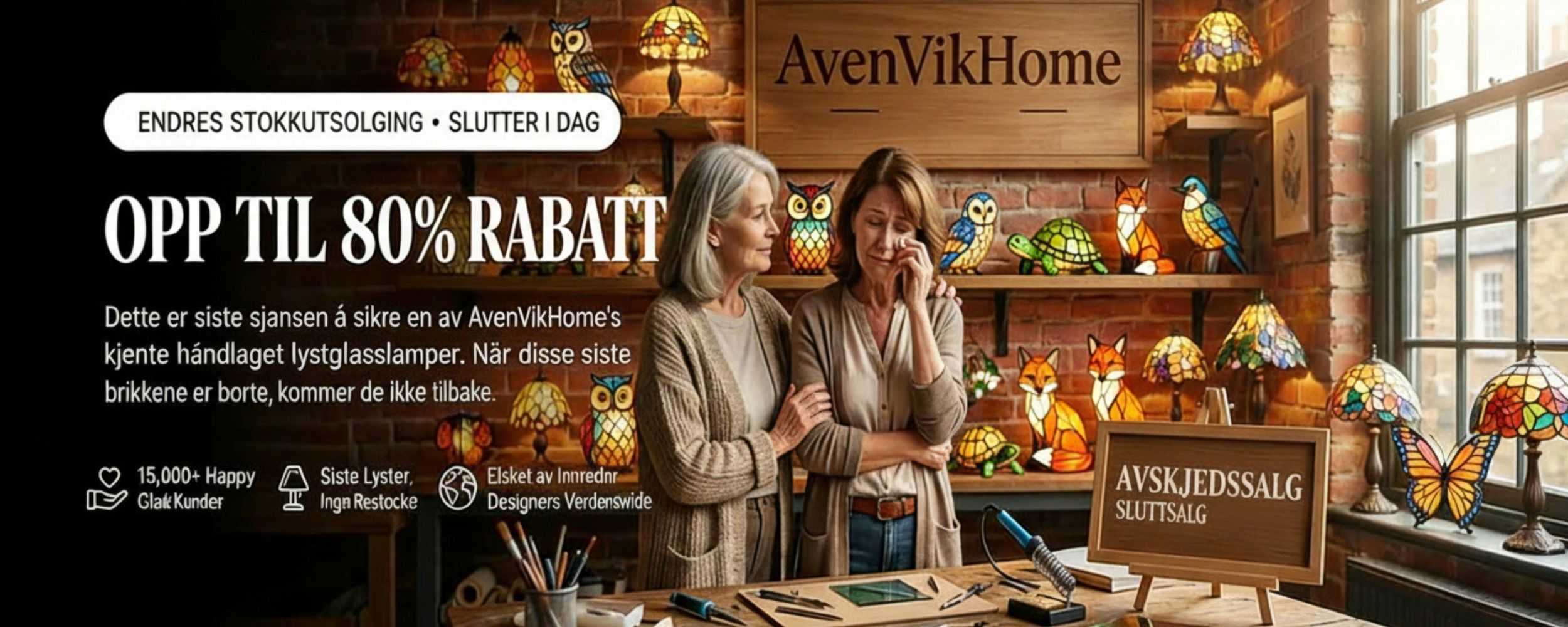 Nå, med bare et begrenset antall håndlagde lamper igjen, lar vi dem gå slik at de kan fortsette sin historie i hjemmet ditt — med rabatter på opptil 80%, helt til de siste produktene finner sitt faste sted.